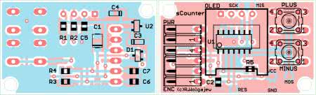 Montaż urządzenia rozpoczynamy od warstwy BOTTOM, gdzie przylutowujemy wszystkie elementy bierne oraz półprzewodniki. Następnie przechodzimy na warstwę TOP, gdzie w pierwszej kolejności przylutowujemy mikrokontroler, następnie elementy bierne, dalej wyświetlacz OLED, posiłkując się złączem goldpin, a na samym końcu montujemy złącza ENC i PWR oraz przyciski funkcyjne PLUS i MINUS.