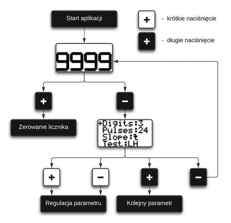 Dodatkowa pozycja tego menu niepodlegająca regulacji to pozycja Test. Umożliwia ona poprawne, wzajemne ustawienie podłączonych czujników szczelinowych, tak aby każdy z nich w danym położeniu wystawiał na wyjście inny stan logiczny. Oczekiwane wartości to: LH lub HL. Jest to konieczne dla poprawnego zliczania i detekcji kierunku obrotów przez 2 czujniki szczelinowe położone obok siebie i obsługiwane przez to samo koło szczelinowe. Niezbędna może okazać się modyfikacja standardowego koła szczelinowego i jego odpowiednie położenie w stosunku do czujników szczelinowych, co należy dobrać na drodze eksperymentalnej. Sposób obsługi urządzenia sCounter i znaczenie poszczególnych przycisków funkcyjnych pokazano na rysunku 5.