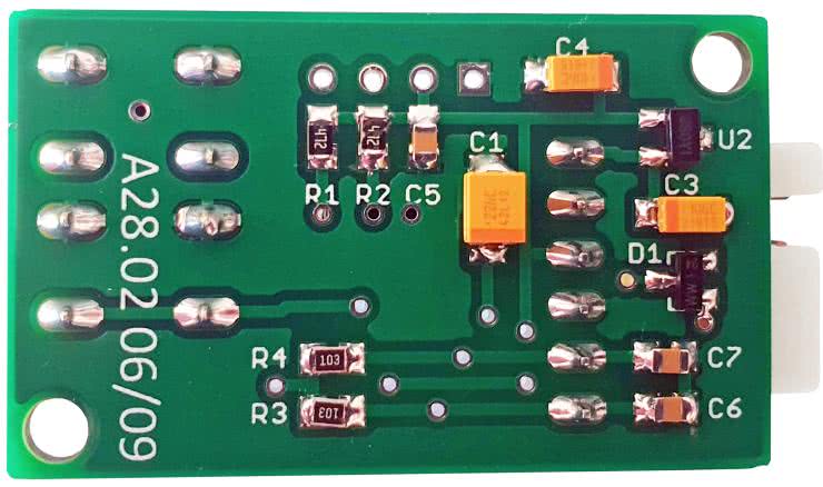 Schemat montażowy został pokazany na rysunku 3. Zaprojektowano bardzo małą dwustronną płytkę drukowaną z przewagą elementów do montażu powierzchniowego SMD montowanych po obu stronach obwodu drukowanego.