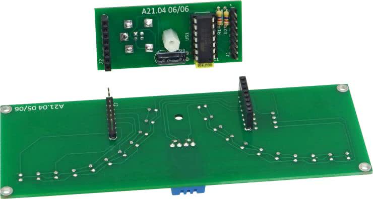 Montaż proponuję rozpocząć od elementów o najmniejszej wysokości obudowy, czyli rezystorów. Pod układ US1 na płytce sterującej proponuję zastosować podstawkę, aby ułatwić jego programowanie oraz wymianę w razie uszkodzenia. Kondensator C1 na płytce wyświetlacza oraz C2 na płytce sterującej należy położyć na powierzchni płytki. Zmontowany układ można zobaczyć na fotografii 1.