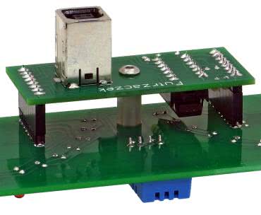 Obie płytki są ze sobą połączone dwoma złączami, po 8 pinów każde. W układzie prototypowym zostały one obrócone względem siebie (po prawej stronie płytki wyświetlacza znajduje się złącze żeńskie, zaś męskie po lewej) aby uniemożliwić przypadkowe wetknięcie tych płytek odwrotnie. Mogłoby to uszkodzić układ, a na pewno byłoby przyczyną nieprawidłowego działania. Tak wlutowane złącza widać na fotografii 1, a na fotografii 2 znajduje się widok dwóch płytek już złączonych ze sobą, które dodatkowo skręcono tuleją dystansową. W ten sposób relatywnie gruby i ciężki kabel USB nie wyciągnie tych złączy szpilkowych.