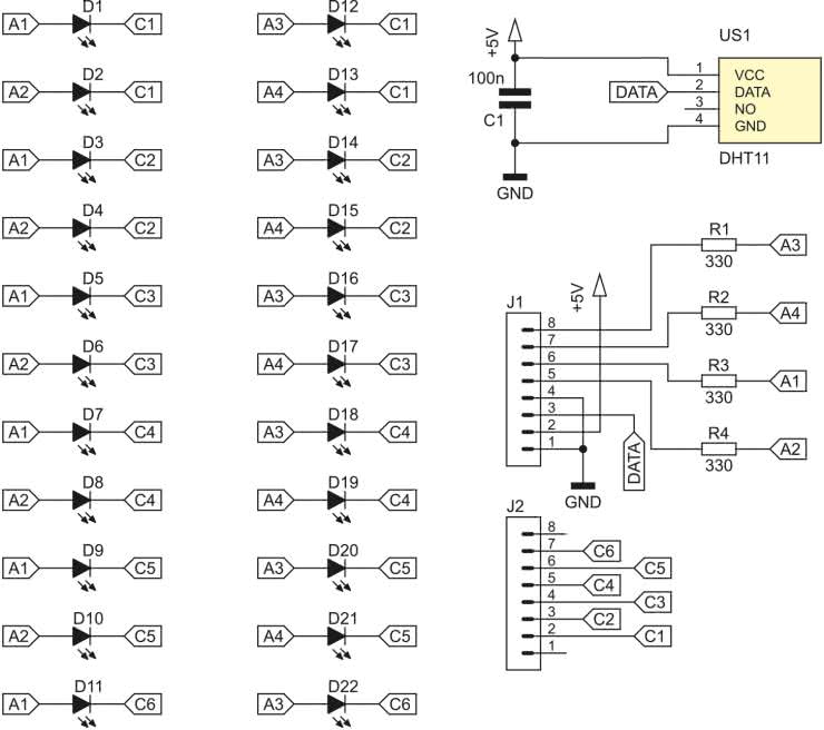 Urządzenie składa się z dwóch płytek – wyświetlacza i części sterującej. Schemat ideowy wyświetlacza został pokazany na rysunku 1. Zawiera łącznie 22 diody LED, z których jedna połowa służy do wyświetlania temperatury w stopniach Celsjusza [°C], a druga do wskazywania wilgotności względnej [% RH]. Diody te zostały połączone w sześć grup, załączanych poprzez linie C1…C6. W ramach każdej z tych grup znajdują się cztery anody A1…A4 – poza ostatnią grupą, która ma tylko dwie diody. Prąd anody każdej anody jest ograniczany rezystorem szeregowym R1…R4. Sterowanie odbywa się więc w trybie multipleksowym, grupa po grupie.