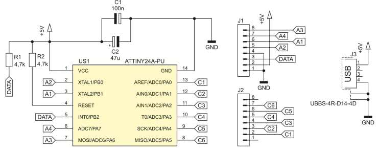 Na rysunku 2 znajduje się schemat ideowy płytki sterującej, której głównym elementem jest mikrokontroler typu ATtiny24A-PU. Oprócz wspomnianego rezystora podciągającego zawiera drugi, identyczny rezystor, który podciąga do dodatniej linii zasilania wyprowadzenie zerujące mikrokontrolera.