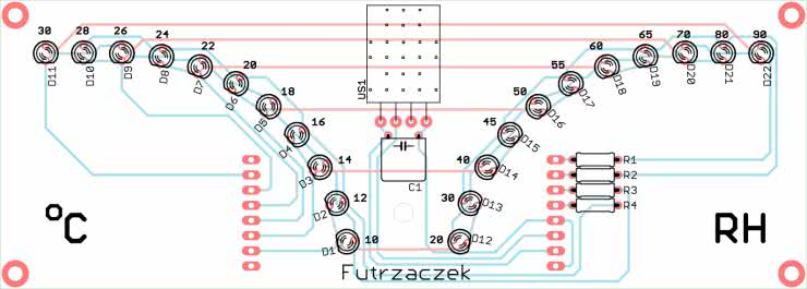 Na płytce wyświetlacza znajduje się również czujnik temperatury i wilgotności typu DHT11 – układ US1. Ma on interfejs cyfrowy, który wymaga tylko jednej linii do prowadzenia komunikacji z mikrokontrolerem. Jest kalibrowany na etapie produkcji, co upraszcza uruchamianie układu. Przy jego wyprowadzeniach zasilania znajduje się kondensator C1, zalecany przez notę katalogową producenta tego układu. Niezbędny do prawidłowego działania rezystor podciągający linię danych znalazł się na drugiej płytce.