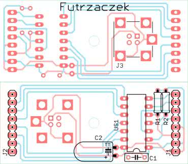 Układ został zmontowany na dwóch dwustronnych płytkach drukowanych. Płytka wyświetlacza ma wymiary 135×48 mm, a sterująca (z mikrokontrolerem) 58×25 mm. Ich schematy zostały pokazane odpowiednio na rysunku 3 i rysunku 4. W odległości 2,54 mm od krawędzi płytki wyświetlacza znalazły się cztery otwory montażowe, każdy o średnicy 2,5 mm. Ponadto w obu płytkach jest zlokalizowany jeszcze jeden otwór, którego rola zostanie omówiona dalej.