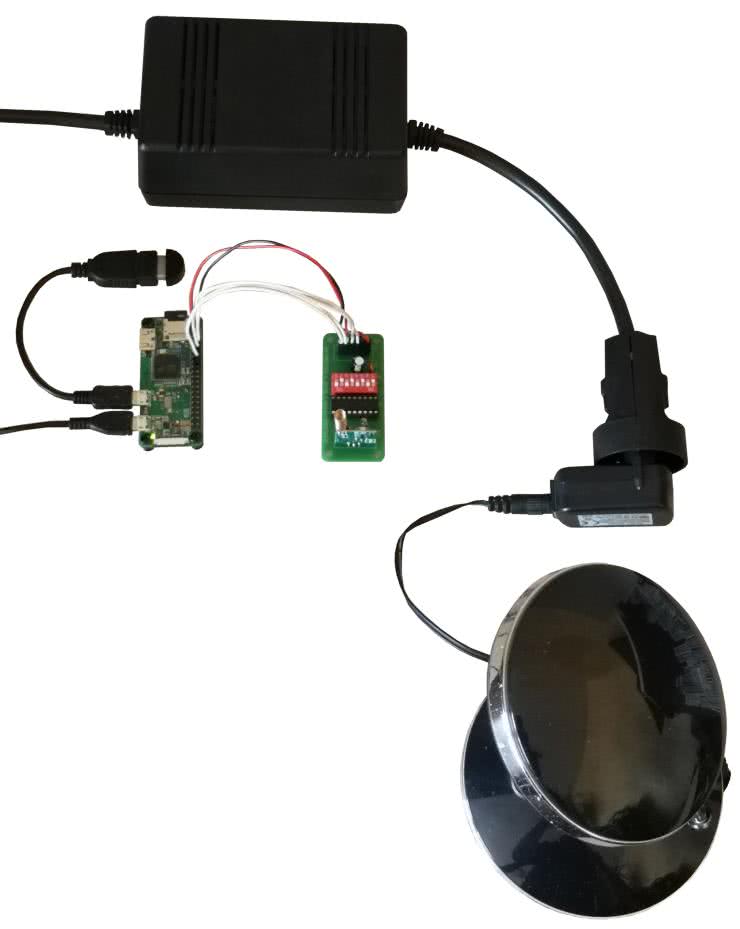 Dla sprawdzenia działania i zademonstrowania możliwości zestawu uruchomimy na nim system sterowania komendami głosowymi. W tym celu dołączamy do komputerka mikrofon USB, a jedno z wejść modułu nadawczego łączymy z wyprowadzeniem nr 8 (GPIO14) komputerka. Przykładowy układ testowy prezentuje fotografia 3.