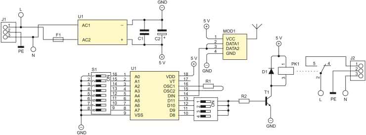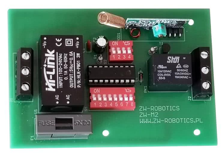 Schemat ideowy modułu odbiorczego ZW-M2 został pokazany na rysunku 3. Do złącza J1 należy podłączyć napięcie sieciowe 230 V AC, które przez bezpiecznik F1 trafia na wejście kompaktowego modułu zasilacza U1 typu HLK-PM01. Napięcie wyjściowe z zasilacza ma wartość 5 V i jest dodatkowo filtrowane przez kondensatory C1 oraz C2. Element opisany jako MOD1 to gotowy moduł radiowy – odbiornik na pasmo 433 MHz. Odebrane sygnały trafiają do dekodera U2 typu HT12D. Przełącznik S1 służy do ustawienia adresu w dekoderze. Jeśli będzie taki sam jak w nadajniku, to urządzenia będą ze sobą współpracowały. Rezystor R1, podobnie jak w nadajniku, wyznacza częstotliwość pracy wbudowanego w układ U2 oscylatora.
