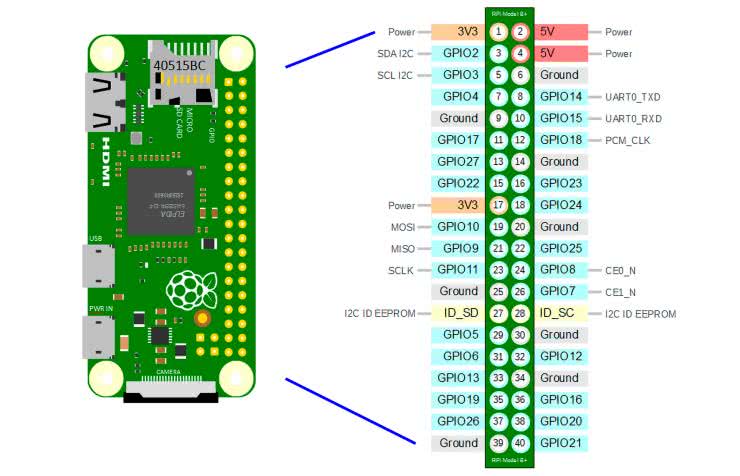 Do modułu odbiorczego można już podłączyć urządzenie, które będzie sterowane zdalnie, a sam moduł należy dołączyć do zasilania. Moduł nadawczy należy połączyć z minikomputerem Raspberry Pi za pomocą przewodów zakończonych złączami żeńskimi. Zasilanie o napięciu 3,3 V jest dostępne na wyprowadzeniu nr 1, a masa np. na wyprowadzeniu nr 9 (rysunek 5). Wyprowadzenia sygnałów sterujących będzie definiowała docelowa aplikacja uruchomiona na Raspberry Pi.