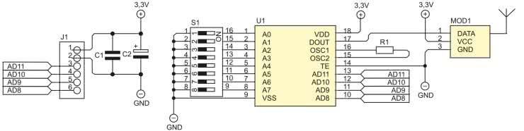 Schemat ideowy modułu nadawczego ZW-M1 został pokazany na rysunku 1. Złącze J1 służy do podłączenia napięcia zasilania o wartości 3,3 V, które jest filtrowane przez kondensatory C1 oraz C2. Do tego samego złącza należy podłączyć 4 sygnały sterujące, które trafiają do wejść scalonego enkodera U1 typu HT12E. Za pomocą 8-sekcyjnego przełącznika S1 ustawiany jest adres w enkoderze. Dzięki temu na sygnał enkodera będą reagowały tylko odbiorniki z ustawionym takim samym adresem. Rezystor R1 ustala częstotliwość pracy wbudowanego oscylatora.
