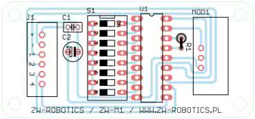 Element oznaczony jako MOD1 to gotowy moduł radiowy nadajnika na pasmo 433 MHz, który zamienia sygnał dochodzący z enkodera na fale radiowe. Jeden moduł nadawczy umożliwia zdalne sterowanie czterema modułami odbiorczymi. Schemat płytki drukowanej modułu nadawczego został pokazany na rysunku 2.