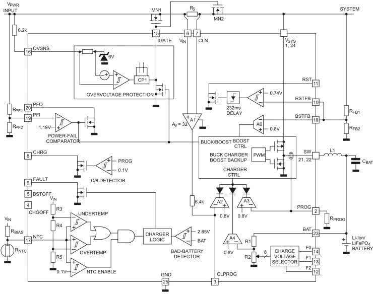 Dzięki zastosowaniu specjalizowanego kontrolera typu LTC4040, aplikacja zawiera niewiele elementów zewnętrznych ograniczających się do dzielników rezystorowych układów monitorowania napięć, klucza wykonawczego i elementów przetwornicy DC/DC. Strukturę wewnętrzną kontrolera pokazano na rysunku 1. Wbudowana ładowarka i przetwornica mają wszystkie niezbędne zabezpieczenia wymagane do bezpiecznej eksploatacji akumulatorów.