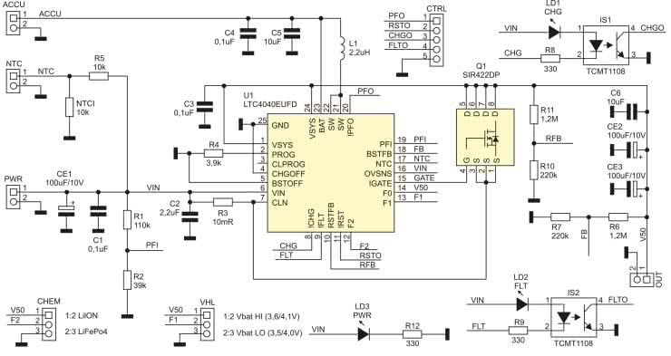 Akumulator jest podłączony do zacisków 1 i 2 złącza ACCU. Do współpracy z zasilaczem należy stosować akumulatory z wbudowanym układem zabezpieczeń PCM. Termistor NTC zabezpiecza akumulator przed ładowaniem przy zbyt wysokiej (>40°C) lub niskiej (<0°C) temperaturze. Układ U1 sygnalizuje przekroczenie progów temperatury NTC. Optymalnym rozwiązaniem jest wbudowanie termistora w ogniwo lub przynajmniej umieszczenie go w bezpośrednim jego sąsiedztwie i podłączenie go z użyciem złącza termistora NTC.