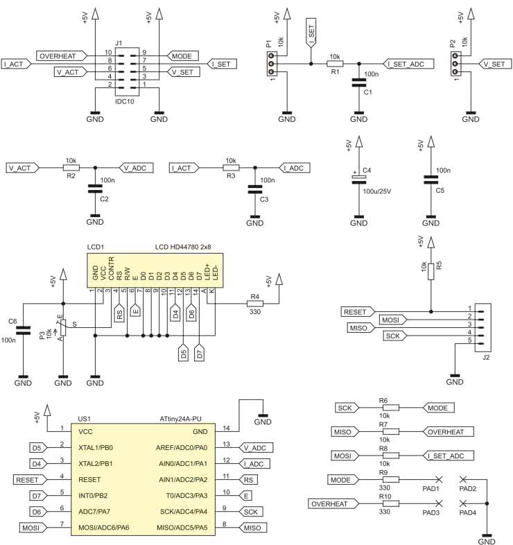 Omawiany układ zasilacza został zbudowany na dwóch płytkach drukowanych, dlatego ich schematy zostaną omówione oddzielnie. Schemat ideowy płytki przedniej, zawierającej wyświetlacz LCD i potencjometry regulacyjne, znajduje się na rysunku 1. Najistotniejszym elementem na tej płytce jest mikrokontroler typu ATtiny24A, którego zadaniem jest pomiar odpowiednich napięć i obsługa wyświetlacza. Nie realizuje on zadań krytycznych czasowo, zatem jego rdzeń jest taktowany wbudowanym oscylatorem RC o częstotliwości około 8 MHz. Rezystor R5 podciąga wyprowadzenie zerujące mikrokontroler do potencjału linii zasilającej, wspomagając tym rezystor wbudowany w ATtiny24A. Za pośrednictwem złącza J2 można programować zarówno pamięć Flash tego układu, jak i konfigurować jego bity zabezpieczające.