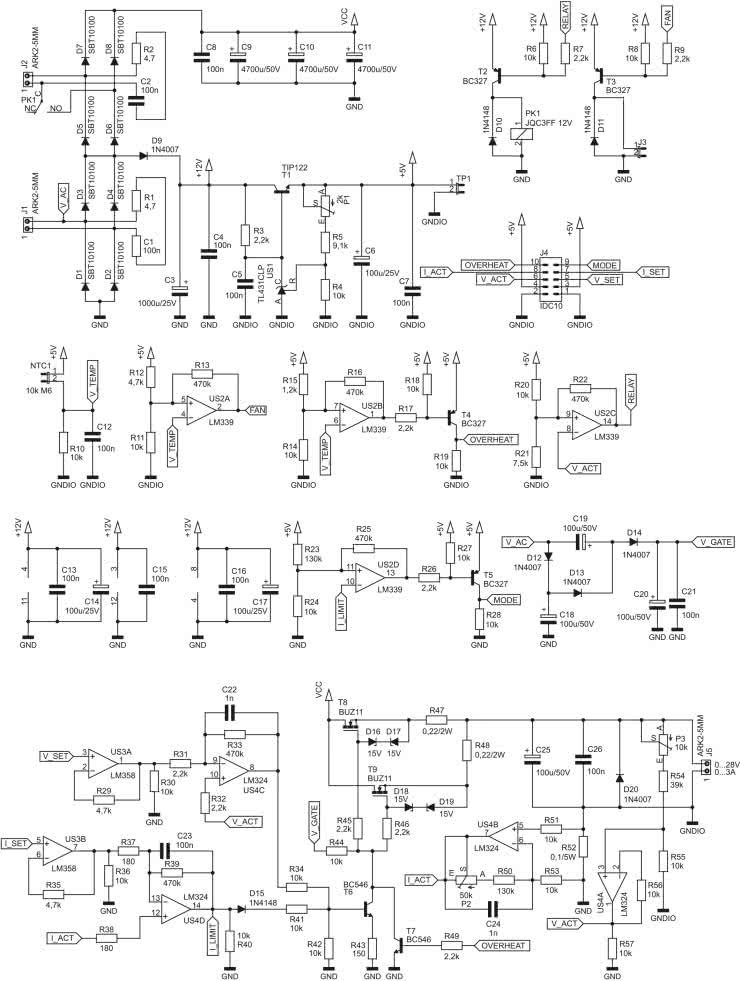 Do zasilania wyświetlacza, wentylatora, przekaźnika i innych układów pomocniczych nie został użyty oddzielny transformator, lecz ten sam, rozdzielone zostały jedynie drogi prądów. Dioda D9 doładowuje kondensator C3 wyprostowanym dwupołówkowo prądem pochodzącym z mostka D1…D4. Jednocześnie stabilizator główny zasilacza nie pobiera prądu z C3, więc pojemność tego kondensatora może nie być duża. Niestabilizowane napięcie o wartości około 12 V (w praktyce wyższej – 16…20 V) jest wykorzystywane do zasilania wentylatora chłodzącego radiator, cewki przekaźnika PK1 oraz wzmacniaczy operacyjnych i komparatorów.