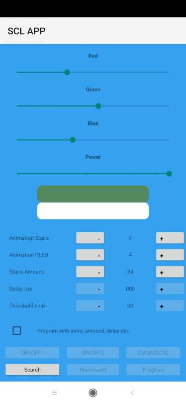 Z aplikacji na telefonie mamy możliwość zmiany wszystkich ustawień oraz sprawdzenie wszystkich diod LED za pomocą trybu diagnostycznego. Okno aplikacji zostało pokazane na rysunku 7. Z poziomu aplikacji jest też możliwość załączenia lub wyłączenia podświetlania schodów. Przy pierwszym uruchomieniu aplikacji należy zezwolić na dostęp do Bluetooth oraz lokalizacji, a następnie należy utworzyć połączenie ze sterownikiem. W tym celu trzeba nacisnąć przycisk SEARCH, a następnie poczekać chwilę, aż zostanie wyszukany sterownik. Po wyszukaniu dostępnych urządzeń należy zaznaczyć to o nazwie, SCL-BT oraz kliknąć Wybierz, a następnie należy wpisać hasło: 1234. Po udanym połączeniu na sterowniku zaświeci się w trybie ciągłym druga dioda LED umieszczona w pobliżu modułu Bluetooth HC-05. Od tego momentu użytkownik ma możliwość wysyłania komend do sterownika.