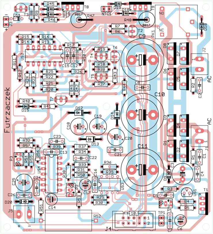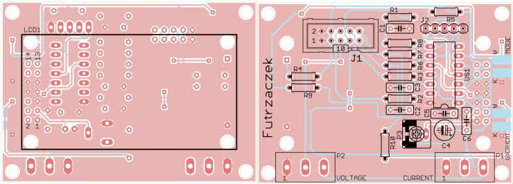 Układ został zmontowany na dwóch dwustronnych płytkach drukowanych. Przednia ma wymiary 69×49 mm, natomiast dolna 100×110 mm. Ich schematy zostały pokazane odpowiednio na rysunku 3 i rysunku 4. W odległości 3 mm od krawędzi obu płytek znajdują się po cztery otwory montażowe, każdy o średnicy 3,2 mm, zaś na środku dolnej płytki jest jeszcze jeden, piąty otwór.