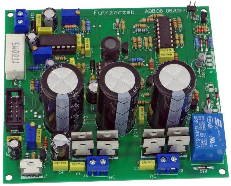 Z kolei płytkę dolną można uzbrajać w elementy według własnej wygody, ale bez tranzystorów T8 i T9 oraz termistora NTC1. Te należy przykręcić do radiatora, a dopiero potem przylutować do laminatu, o czym dalej. Na tym etapie płytka dolna powinna wyglądać tak, jak na fotografii 4.