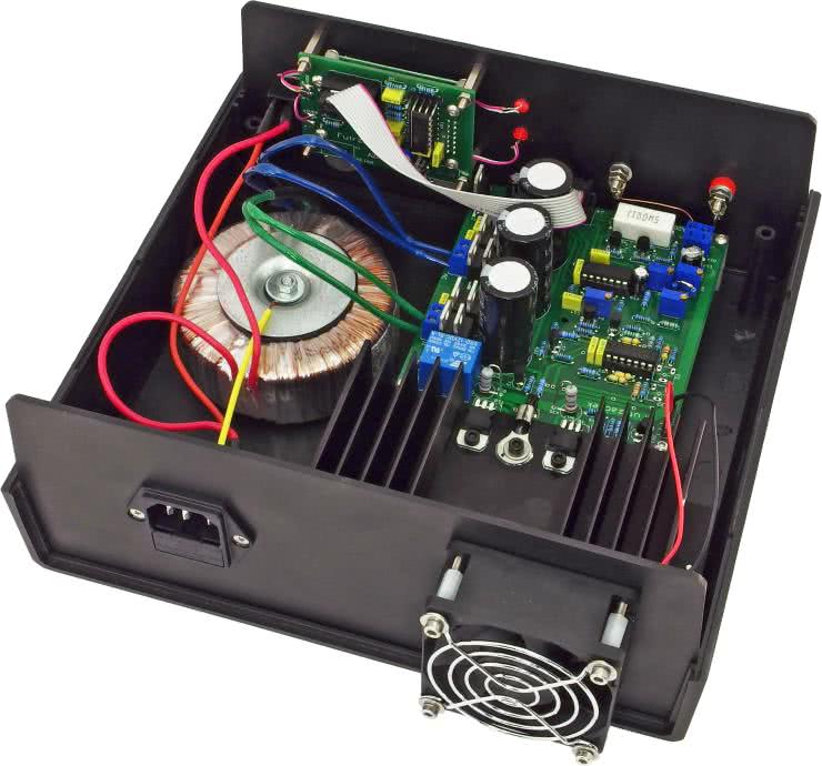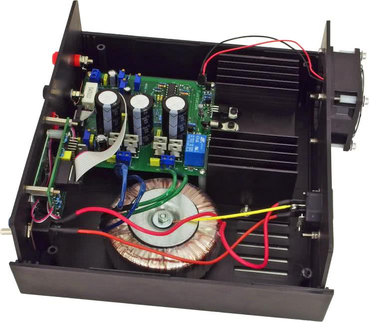 Ostatnim etapem jest podłączenie. Uzwojenie pierwotne transformatora należy podłączyć do gniazda IEC za pośrednictwem wyłącznika. Uzwojenia wtórne (najlepiej w tej samej kolejności, choć nie jest to wymóg krytyczny) do zacisków AC na płytce dolnej. Diody LED sygnalizujące przegrzanie (dolna) i przejście w tryb źródła prądowego (górna) należy przylutować do pól lutowniczych na płytce przedniej. Wentylator trzeba podłączyć do podwójnego złącza szpilkowego J3. Zostały zaciski wyjściowe – te trzeba połączyć grubym przewodem z zaciskami napięcia wyjściowego płytki dolnej. Taśmy IDC10 na razie nie podłączamy.