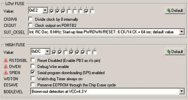 W ten sposób zostanie wyłączony preskaler sygnału zegarowego oraz włączy się Brown-Out Detector, który wprowadzi mikrokontroler w stan zerowania, jeżeli jego napięcie zasilające spadnie poniżej 4,3 V. To znacznie zmniejsza ryzyko zawieszenia się układu podczas uruchamiania.