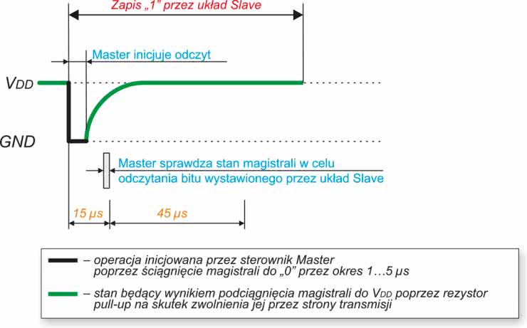 Dalej, na rysunku 4 pokazano sekwencję sygnałów sterujących obrazującą operacje odczytu danych wykonywaną przez układ Slave a będącą wynikiem zapisu tychże danych dokonanego przez układ Master (jak wcześniej, inicjowaną poprzez ściągnięcie magistrali do masy przez czas 1…5 μs).