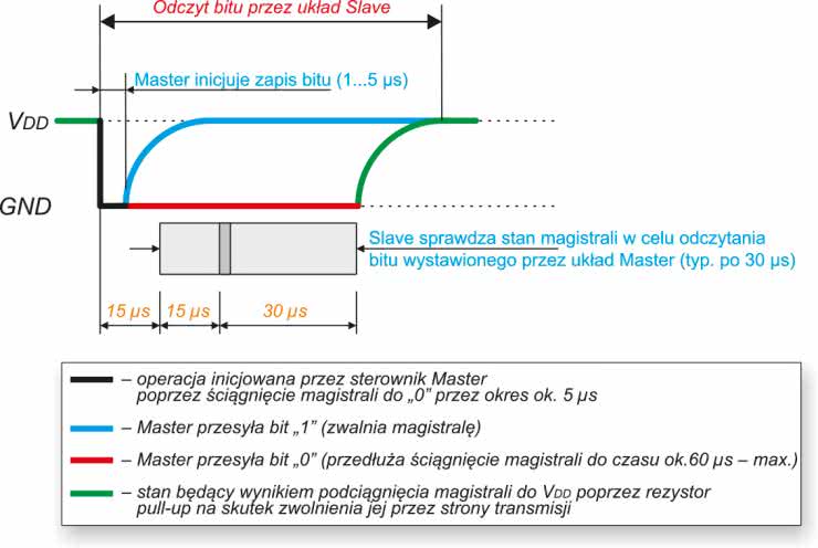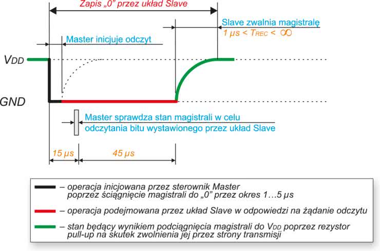Na rysunkach 2 i 3 pokazano z kolei sekwencje sygnałów sterujących obrazujące operację zapisu danych (logicznego „0” i „1”) przez układ Slave na magistralę 1-Wire a będącą wynikiem żądania odczytu ze strony układu Master (ściągnięcie magistrali do masy przez czas 1…5 μs).