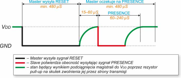 Na rysunku 1 pokazano sekwencję inicjalizacji magistrali 1-Wire, która to, jak wspomniano wcześniej, umożliwia układowi Master wykrycie podłączonych do magistrali układów Slave. Sekwencja ta rozpoczyna się poprzez wysłanie przez układ Master sygnału Reset (ściągnięcie magistrali do masy przez czas 480 μs) i po odczekaniu czasu 15…60 μs, odpowiedzią układów Slave poprzez wysłanie sygnału Presence (ściągnięcie magistrali do masy przez czas 60…240 μs).