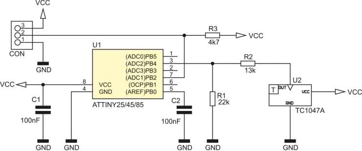 W tym miejscu dysponujemy już niezbędną wiedzą z zakresu protokołu 1-Wire przejdźmy zatem do schematu ideowego naszego urządzenia, który pokazano na rysunku 6. Jak widać, zaprojektowano bardzo prosty, wręcz trywialny, system mikroprocesorowy, którego sercem jest niewielki mikrokontroler ATtiny25 taktowany wewnętrznym oscylatorem 8 MHz odpowiedzialny za realizację całej, założonej funkcjonalności.