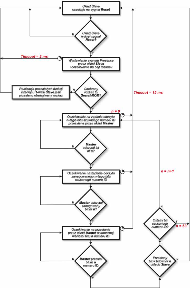 Na koniec, na rysunku 5, zaprezentowany jest graf funkcjonalny bodajże najciekawszego mechanizmu charakterystycznego wyłącznie dla magistrali tego typu a przeznaczonego do wyszukania adresów wszystkich układów do niej przyłączonych nazywany SEARCH ROM. Należy bowiem pamiętać, że układ Master nie musi znać adresów przyłączonych do magistrali układów, w związku z czym musi istnieć pewny mechanizm na ich ustalenie. Operacja taka inicjowana jest poprzez wysłanie przez układ Master rozkazu 0xF0 (zwanego SEARCH ROM).