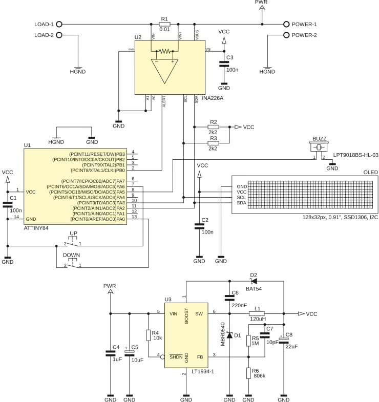 Jak widać, jest to bardzo prosty system mikroprocesorowy, którego sercem jest niewielki mikrokontroler firmy Microchip (dawniej Atmel) typu ATtiny84 taktowany wewnętrznym generatorem RC o częstotliwości 8 MHz, odpowiedzialny za programową implementację interfejsu I²C, przy użyciu którego mikrokontroler realizuje obsługę układu INA226 będącego specjalizowanym, bardzo dokładnym, 16-bitowym, różnicowym przetwornikiem ADC oraz obsługę niewielkiego acz bardzo efektownego wyświetlacza OLED o rozdzielczości 128×32 piksele stanowiącego element graficznego interfejsu użytkownika. Ponadto mikrokontroler nasz odpowiedzialny jest za obsługę 2 switchy UP i DOWN wykorzystując w celu eliminacji drgań wbudowany układ czasowo-licznikowy Timer0 i stosowne przerwanie systemowe oraz obsługę BUZZER-a piezoelektrycznego (bez wewnętrznego generatora), co realizowane jest z kolei z użyciem układu czasowo-licznikowego Timer1 pracującego w trybie PWM i generującego przebieg prostokątny o częstotliwości 4 kHz na wyprowadzeniu OC1B zasilający nasz BUZZER.