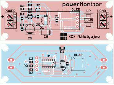 Projektując interfejs użytkownika urządzenia powerMonitor kierowałem się zasadą maksymalnego uproszczenia sposobu obsługi układu, jak i chęcią wyposażenia go w odpowiednią paletę możliwości. W realizacji tego celu posłużyłem się niewielkim, lecz bardzo atrakcyjnym wyświetlaczem OLED o organizacji 128×32 piksele oraz dwoma mikroprzełącznikami oznaczonymi umownie jako UP i DOWN, przy czym program obsługi aplikacji rozróżnia krótkie i długie naciśnięcie każdego ze switchy.