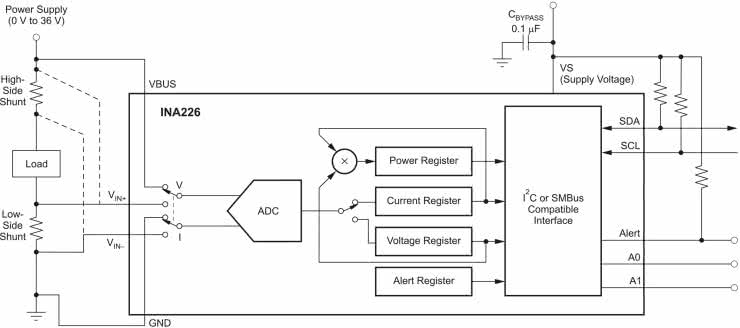 Wspomniany wcześniej, specjalizowany przetwornik ADC mierzy spadek napięcia na rezystorze szeregowym R1 (10 mΩ), dzięki czemu możliwe jest wyznaczenie prądu pobieranego przez badane urządzenie. Nie jest to jednak zwykły, zewnętrzny przetwornik ADC jakich wiele na rynku a specjalizowany układ przeznaczony do pomiaru prądu, napięcia i mocy urządzeń zasilanych napięciem stałym. Jako że jest to element dość wyjątkowy warto choćby skrótowo zaznajomić się z jego specyfikacją. Tak, jak napisano wcześniej, układ INA226, produkcji firmy Texas Instruments, jest specjalizowanym, bardzo dokładnym, 16-bitowym, różnicowym przetwornikiem pomiarowym ADC przeznaczonym do zastosowania w układach pomiaru prądu i mocy z użyciem bocznika rezystancyjnego. Układ ten wyróżnia się następującymi, wybranymi cechami użytkowymi: