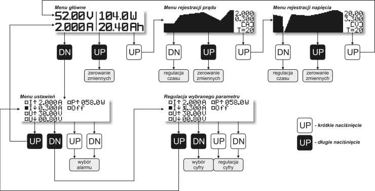 Wygląd wszystkich ekranów systemu Menu pokazano na rysunku 4. Obsługa urządzenia polega na przechodzeniu pomiędzy kolejnymi ekranami (poza ekranem ustawień) i dokonujemy tego przy pomocy krótkiego wciśnięcia switcha UP. Długie wciśnięcie przycisku UP powoduje z kolei zerowanie zmiennych: w przypadku ekranu głównego jest to ładunek dostarczony do odbiornika, zaś w przypadku ekranów rejestracji jest to zawartość wykresu, jak i zarejestrowane minimum i maksimum. Długie przyciśnięcie przycisku DOWN na ekranie głównym powoduje przejście do ekranu ustawień alarmowania. Powyższe zasady to wyłącznie drobny wycinek funkcjonalności przycisków sterujących, gdyż ich znaczenie w procesie obsługi urządzenia (wliczając w to fakt krótkiego czy długiego przyciśnięcia) determinowane jest miejscem w systemie Menu, w jakim znajduje się urządzenie. Diagram prezentujący kompletny sposób obsługi urządzenia powerMonitor pokazano na rysunku 5.