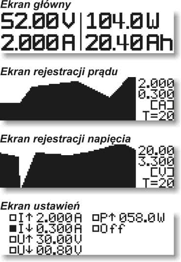 - ekran główny, w ramach którego wyświetlane jest napięcie na zaciskach odbiornika, prąd pobierany przez odbiornik oraz moc i ładunek dostarczany do odbiornika,