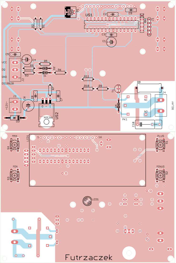 Układ został zmontowany na dwustronnej płytce drukowanej o wymiarach 120×90 mm. Jej schemat został pokazany na rysunku 2.