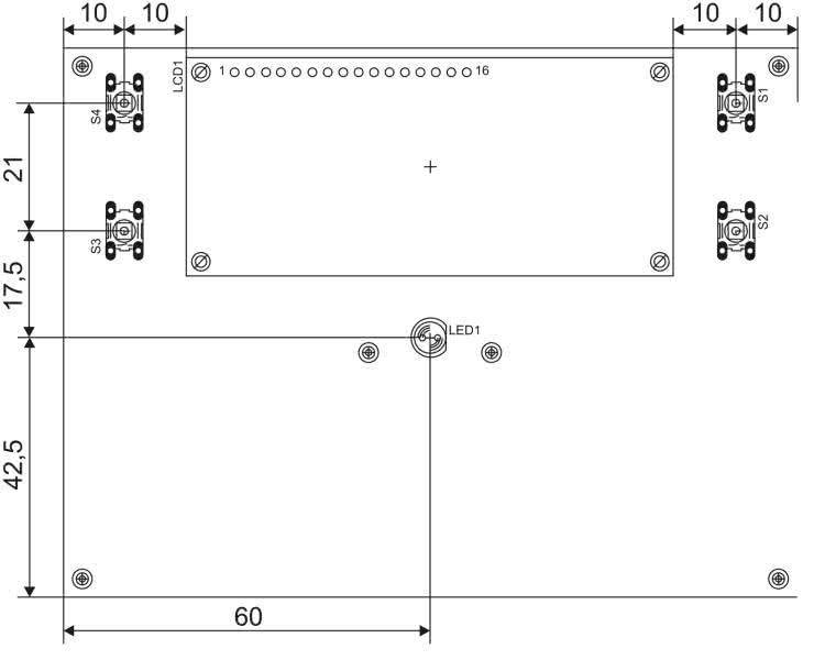 Na drugiej stronie płytki jest miejsce dla wyświetlacza LCD1, czterech przycisków S1…S4 i diody LED1. Ich lokalizację po przylutowaniu pokazuje fotografia tytułowa. Pod koniec montażu, po wlutowaniu diody LED1 i przycisków, należy przykręcić wyświetlacz LCD przy pomocy czterech tulei dystansowych oraz przylutować jego złącza. Warto lutowanie zostawić na sam koniec, po dokładnym przykręceniu, aby ewentualny naddatek wysokości tulei mógł być skompensowany przez lekkie wystawanie złącz z powierzchni płytki. W ten sposób część męska i żeńska wchodzą w siebie całkowicie, co zapewnia dobry kontakt elektryczny między nimi. Rozmieszczenie przycisków, diody LED i wyświetlacza na powierzchni płytki znajduje się na rysunku 4, dzięki niemu łatwiejsze będzie wykonanie obudowy dla tego urządzenia.