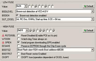 Na etapie uruchamiania jest konieczne zaprogramowanie pamięci Flash mikrokontrolera dostarczonym wsadem oraz zmiana jego bitów zabezpieczających. Oto ich nowe wartości:
