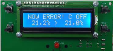 Ostatnią sytuację wartą omówienia można zobaczyć na fotografii 4. Kiedy z czujnikiem temperatury odbyła się przynajmniej jedna poprawna transmisja (do tego momentu na wyświetlaczu są poziome kreski w miejscu temperatury aktualnej) i nastąpiło jego uszkodzenie, zamiast temperatury aktualnej pojawia się napis ERROR! Przekaźnik zostaje wyłączony, układ czeka na reakcję człowieka. Może tak się stać, na przykład, po odłączeniu linii DQ czujnika DS18B20 albo po jej zwarciu z masą.