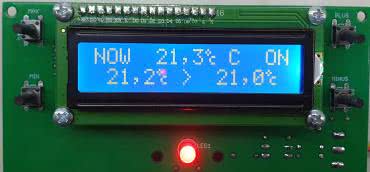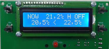 Przykładowy widok ekranu pokazuje fotografia 2. W górnym wierszu można zobaczyć temperaturę aktualną z rozdzielczością 0,1°C, automatycznie dobrany tryb działania (tutaj H - od heating, czyli grzanie). Dolny wiersz zawiera dwie, ustawiane przez użytkownika, temperatury: minimalną (lewą, ustawianą przyciskiem S3) oraz maksymalną (prawą, ustawianą przyciskiem S4). Jeżeli maksymalna jest większa od minimalnej, to między nimi znajduje się znak większości, zaś termostat przełącza się w tryb grzania. Przekaźnik załączy się po osiągnięciu temperatury minimalnej lub spadku poniżej tej wartości. Z kolei jego wyłączenie odbędzie się po zrównaniu temperatury aktualnej z maksymalną, bądź jej przekroczeniu.