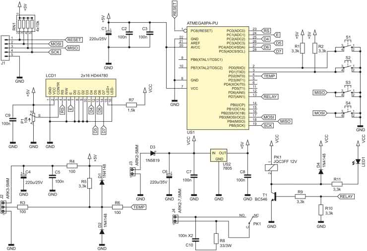 Najistotniejszym elementem jest układ Atmega8A-PU. To mikrokontroler z nadal popularnej i niezawodnej rodziny AVR, mimo iż jest ona dostępna na rynku już od wielu lat. Liczba jego konfigurowalnych wyprowadzeń oraz ilość pamięci są całkowicie wystarczające do realizacji tego zadania. Kondensatory C1…C3 filtrują napięcie zasilające mikrokontroler i zmniejszają impedancję obsługującego go źródła zasilania. Nie zastosowano zewnętrznego rezonatora kwarcowego do stabilizacji częstotliwości sygnału zegarowego, gdyż układ niemal w ogóle nie realizuje zadań krytycznych czasowo. Za jedyną taką czynność można uznać komunikację z cyfrowym czujnikiem temperatury, ponieważ magistrala 1-Wire prowadzi komunikację transmitując impulsy o zadanym czasie trwania, choć i tu są dopuszczalne pewne odchylenia.