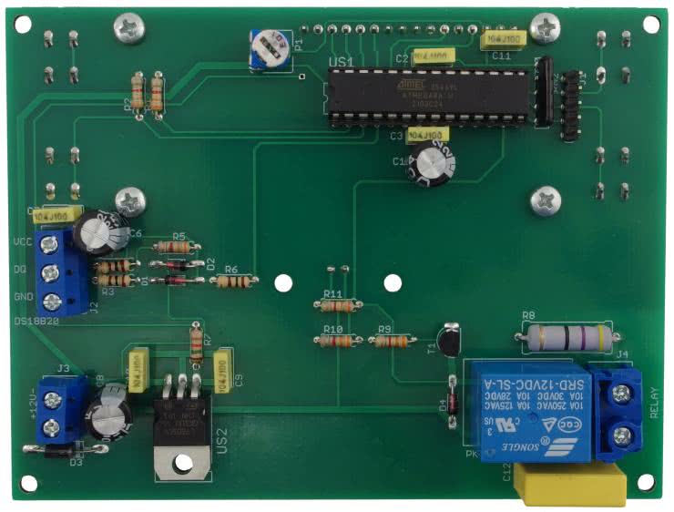 Poprawnie zaprogramowany układ jest gotowy do działania po ustawieniu kontrastu wyświetlacza potencjometrem P1. Do zasilania powinno służyć napięcie stałe o wartości około 12 V, a dokładniej z przedziału 10…16 V. Takie granice uwzględniają zakres prawidłowej pracy przekaźnika (z uwzględnieniem spadku napięcia na diodzie D3 i tranzystorze T1) w temperaturze 20°C. Warto, aby owe napięcie było dobrze filtrowane, a najlepiej stabilizowane. Pobór prądu przy 12 V wynosi około 15 mA przy wyłączonym przekaźniku oraz około 50 mA, kiedy cewka zostanie załączona. Do zacisków złącza J2 należy podłączyć czujnik typu DS128B20, zgodnie z opisami na płytce. Może to być gotowy moduł: z podwójnie izolowanymi przewodami, z samym czujnikiem hermetycznie zaciśniętym w metalowej rurce.