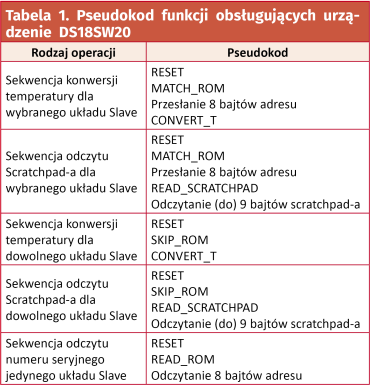 Na koniec, w tabeli 1, pokażę pseudokod funkcji obsługujących nasze urządzenie DS18SW20 (uruchamiany po stronie układu Master). Jak widać, programowa realizacja układu DS1820 jak i interfejsu 1-Wire jest niezmiernie prosta i zarazem bardzo ciekawa i skłania do stosowania tego interesującego interfejsu komunikacyjnego we własnych zastosowaniach czego przykładem niech będą chociażby dwa z moich wcześniejszych projektów zrealizowane w tamtym czasie przy użyciu pakietu Bascom: c-button (kopiarka pastylek DS1990, EP 2/2009) oraz 1-Wire LED (4 segmentowy, 3-kolorowy wyświetlacz LED wyposażony w sprzęg 1-Wire, EP 04/2011).