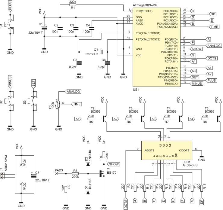 W układzie można znaleźć trzy przyciski monostabilne, służące ustawianiu aktualnego czasu. Zastosowano rezystory podciągające (łączące zwierany styk z dodatnim potencjałem zasilania) wbudowane w mikrokontroler, które w tym układzie są całkowicie wystarczające.