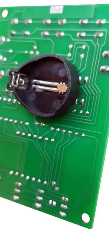 Koszyk na baterię CR2032, jeżeli w danym zastosowaniu okazałby się przydatny, można wlutować od drugiej strony płytki, po zakończeniu montażu wszystkich innych podzespołów i upewnieniu się co do poprawności ich przylutowania. Służą do tego dwa pola lutownicze, oznaczone symbolami + i -, umieszczone pod układem US1. Koszyk należy włożyć w otwory w tych polach, po czym cienkim grotem, prowadzonym równolegle do powierzchni laminatu, przylutować jego wyprowadzenia do pól miedzi. Są one w pewnym oddaleniu od krawędzi koszyka, ale można to zrobić bez uszkodzenia tworzywa sztucznego. Można też zagiąć wyprowadzenia koszyka, które wystają z drugiej strony laminatu, pod podstawką dla mikrokontrolera, aby mocniej trzymał się płytki. Koszyk po przylutowaniu można zobaczyć na fotografii 1.