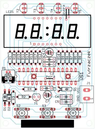 Na płytce znajdują się trzy przyciski S1…S3, którymi można ustawić aktualny czas, ponieważ układ - po włożeniu baterii lub załączeniu zewnętrznego zasilacza - zawsze startuje od godziny 00:00. Przycisk S1 służy do inkrementacji wartości minut i godzin, a S2 do dekrementacji. Wciśnięcie i dłuższe przytrzymanie powoduje przewijanie czasu, które przyspiesza ustawianie. Warto też zaznaczyć, że ustawiana godzina przewija się w kółko, czyli odejmując minutę od godziny 00:00, uzyskamy 23:59, zaś dodając minutę do 23:59 będziemy mieli 00:00. To może znacznie uprościć ustawianie zegara np. późnym wieczorem, ponieważ nie trzeba "przewijać" kilkunastu godzin do przodu, wystarczy kilka do tyłu. Jeszcze jedna, istotna rzecz: przy każdej zmianie wartości minut zerowany jest licznik sekund.
