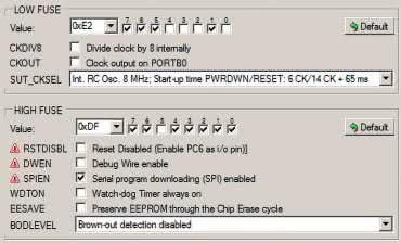 Szczegóły są widoczne na rysunku 3, który zawiera widok okna konfiguracji tych bitów w programie BitBurner. W ten sposób zostanie wyłączony dzielnik częstotliwości wbudowanego generatora sygnału zegarowego. Nie będzie załączony obwód BOD - przy zbyt niskim napięciu zasilającym układ po prostu się wyłączy, a ciągła praca tego obwodu zużywa jakże cenną w tym układzie energię.