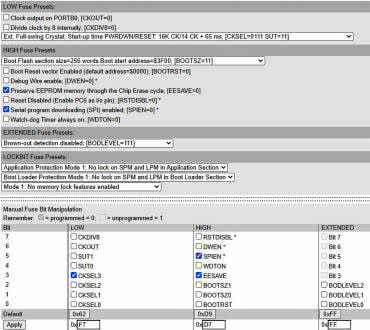 W pierwszych linijkach pliku AVT-5980.c, znajdującego się w kodzie źródłowym do tego projektu, zawarto także gotowe linijki poleceń programu avrdude, potrzebne do zaprogramowania mikrokontrolera. Najpierw należy ustawić bity konfiguracyjne mikrokontrolera zgodnie z rysunkiem 9 (wygenerowanym na stronie: https://eleccelerator.com/fusecalc/). Następnie należy wgrać do układu zawartość pliku mainfile.hex (dostępny także w materiałach do tego projektu). W przypadku wprowadzenia własnych modyfikacji kod całego projektu należy ponownie skompilować.