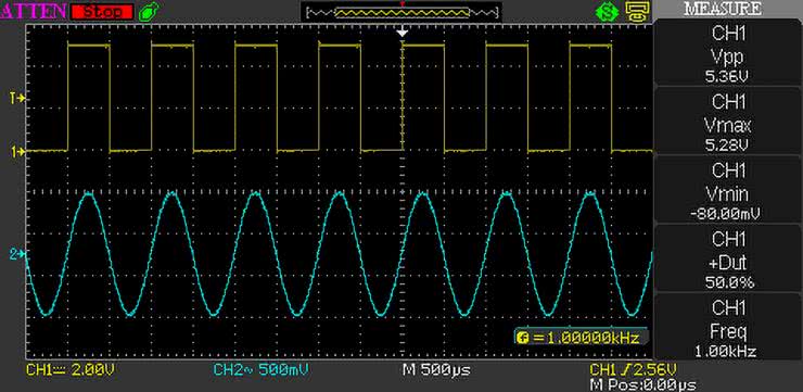 Ważną czynnością, którą należy wykonać po uruchomieniu generatora i opanowaniu jego obsługi, jest wyregulowanie współczynnika wypełnienia przebiegu prostokątnego D na wartość jak najbliższą 50%. Przebieg ten powstaje w szybkim komparatorze układu AD9850 jako efekt porównania odfiltrowanego sygnału sinusoidalnego ze stałym napięciem referencyjnym, ustalanym potencjometrem montażowym, umieszczonym na module generatora DDS (fotografie 1 i 2, pierwsza część artykułu). Wyniki regulacji można weryfikować za pomocą oscyloskopu cyfrowego lub multimetru, wyposażonych w odpowiednią funkcję pomiarową. Można też zastosować uproszczoną (ale całkiem dokładną) metodę polegającą na pomiarze odfiltrowanej dolnoprzepustowo średniej wartości napięcia prostokątnego (filtr RC z R=10 kΩ i C=100 nF będzie wystarczający z zapasem dla testowej częstotliwości Fg=1 MHz). Przy D=50% odfiltrowane napięcie z portu P3 będzie bardzo bliskie połowie napięcia zasilania układów cyfrowych w tym projekcie, czyli około +2,5 V. Fotografii 8 na jednym oscylogramie zaprezentowano przykładowe przebiegi wygenerowanych równolegle sygnałów: sinusoidalnego i prostokątnego o częstotliwości Fg około 1 MHz. Widać na niej prawidłowe ustawienie współczynnika wypełnienia sygnału prostokątnego na D=50% oraz zgodność faz obu pokazanych sygnałów, wynikającą wprost ze sposobu generowania sygnału prostokątnego w syntezerze AD9850.