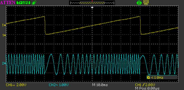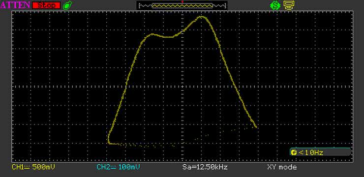 Do prawidłowego zastosowania wobulatora razem z oscyloskopem pracującym w trybie „X/Y” konieczne jest ustawienie zakresu wartości piłokształtnego napięcia sterującego wejściem „X” oscyloskopu, wyprowadzonego na port P4 układu (wyjście SYNCHRO przyrządu). Do tego celu służy potencjometr montażowy PR1 (fotografia 4, druga część artykułu). Sygnał SYNCHRO, generowany w opisywanym przyrządzie, mieści się w zakresie od 0 do +5 V, jednak z uwagi na dobór elementów R15 i PR1 maksymalna wartość szczytowa, możliwa do uzyskania na porcie P4, to około 4,5 V. Ponieważ współczesne oscyloskopy, wyposażone w wejście odchylania poziomego X, mają zwykle możliwość dość szerokiej regulacji wzmocnienia i offsetu także dla tego kanału, rozsądne wydaje się wyregulowanie PR1 na taką wartość szczytową sygnału SYNCHRO, aby uzyskać jak najlepsze warunki do jego dalszego wykorzystania poprzez skalowanie, przesunięcie i – finalnie – dogodną obserwację pełnego zakresu rysowania interesujących nas charakterystyk. Dlatego proponowane do ustawienia na porcie P4 wartości szczytowe, to np. 1, 2 albo 4 V.