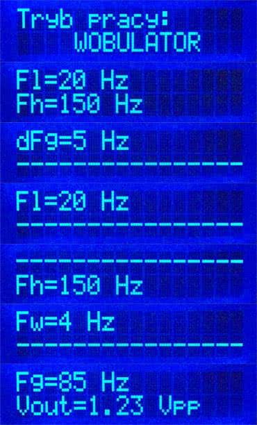 Naciśnięcie przycisku enkodera SW1 spowoduje zatrzymanie regularnej pracy wobulatora oraz przejście do kolejnych ekranów ustawień parametrów. Należą do nich kolejno ekrany ustawień: kroku regulacji częstotliwości dFg, dolnej częstotliwości przemiatania Fl, górnej częstotliwości przemiatania Fh oraz częstotliwości wobulacji Fw. Przechodzenie pomiędzy kolejnymi ekranami (zatwierdzanie ustawień) odbywa się po naciśnięciu przycisku enkodera SW1. Krok regulacji częstotliwości dFg jest wybierany z listy dozwolonych wartości identycznie, jak to miało miejsce w przypadku obsługi generatora. Podobnie jest z wyborem częstotliwości wobulacji Fw, gdzie dopuszczalne wartości mieszczą się w zakresie 4...10 Hz z krokiem 2 Hz. Natomiast zmiany częstotliwości krańcowych Fl i Fh odbywają się analogicznie, jak w przypadku zmian częstotliwości pracy generatora Fg, jednak z dodatkową kontrolą warunku ograniczenia na Fl<Fh w przypadku zmian obu tych wartości. Ostatni ekran menu wobulatora pozwala wyregulować amplitudę sinusoidalnego napięcia wyjściowego Vout w połowie przemiatanego pasma częstotliwości, czyli dla Fg=(Fl+Fh)/2. Po wyjściu z tego ekranu menu program powracamy do regularnego trybu wobulacji, w którym wyświetlane są częstotliwości Fl i Fh a żadna regulacja programowa nie jest możliwa.
