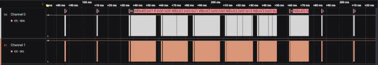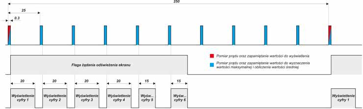 Jak rozwiązałem ten problem konstrukcyjny? Otóż podzieliłem wspomniany proces wyświetlania wartości prądu na 6 etapów (oddzielnie dla każdej z cyfr) przez co program obsługi aplikacji wstrzymywany jest w takim wypadku na maksymalnie 20 ms, co pozwala z kolei na nie pominięcie żadnego z pomiarów. Wymagało to trochę zaangażowania w implementację funkcji wyświetlających, ale ostatecznie zapewniło odpowiedni margines błędów, jak i spełnienie założeń konstrukcyjnych. Na rysunku 3, pokazano w sposób graficzny zależności czasowe aplikacji urządzenia miA podczas wykonywania pomiarów prądu i wyświetlania wartości na ekranie OLED, zaś na rysunku 4, pokazano te same przebiegi, lecz zarejestrowane w układzie rzeczywistym przy pomocy zaawansowanego analizatora stanów logicznych z funkcją dekodowania protokołów transmisji.